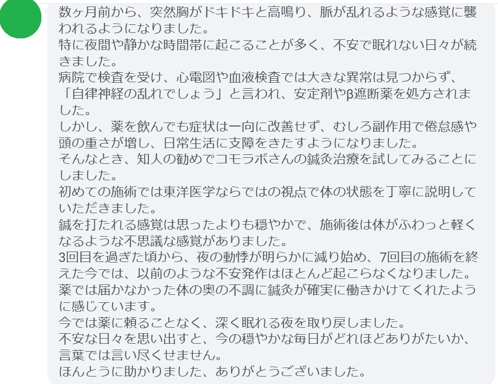 3回目を過ぎた頃から、夜の動悸が明らかに減り始め、7回目の施術を終えた今では、以前のような不安発作はほとんど起こらなくなりました。