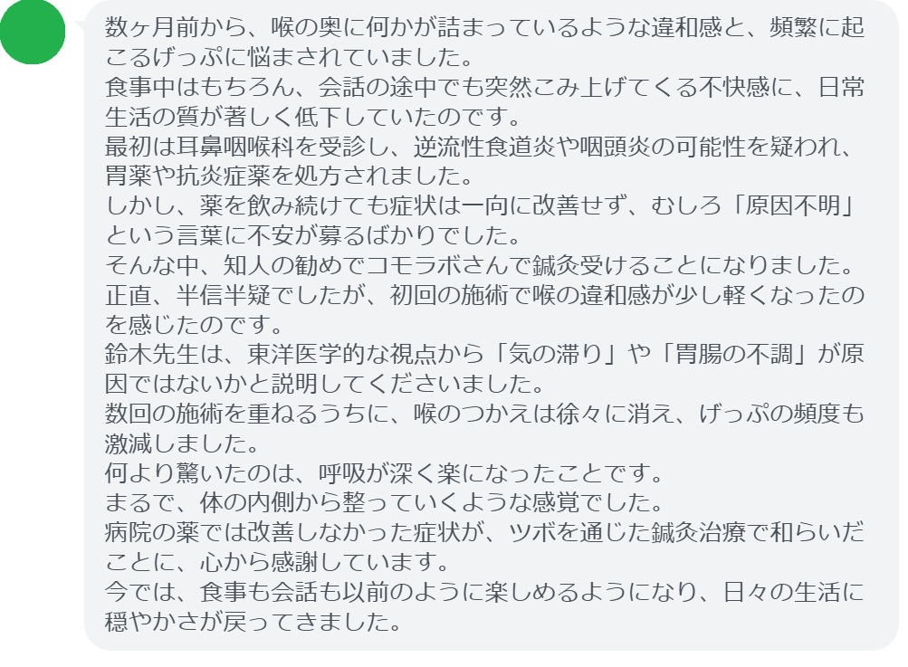 数回の施術を重ねるうちに、喉のつかえは徐々に消え、げっぷの頻度も激減しました。