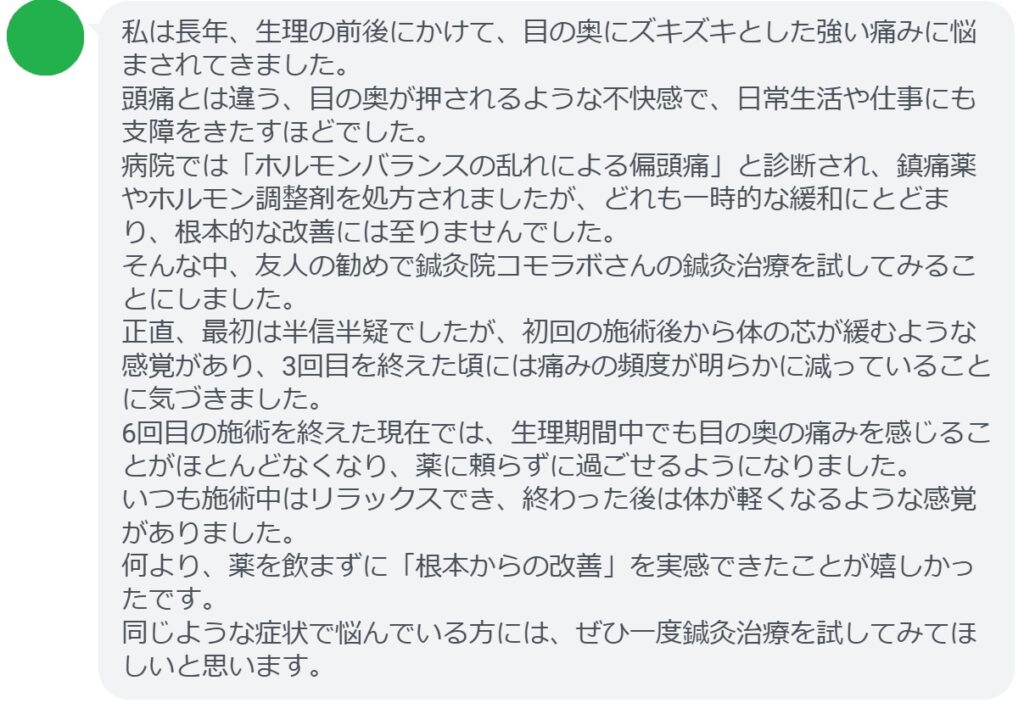 6回目の施術を終えた現在では、生理期間中でも目の奥の痛みを感じることがほとんどなくなり、薬に頼らずに過ごせるようになりました。