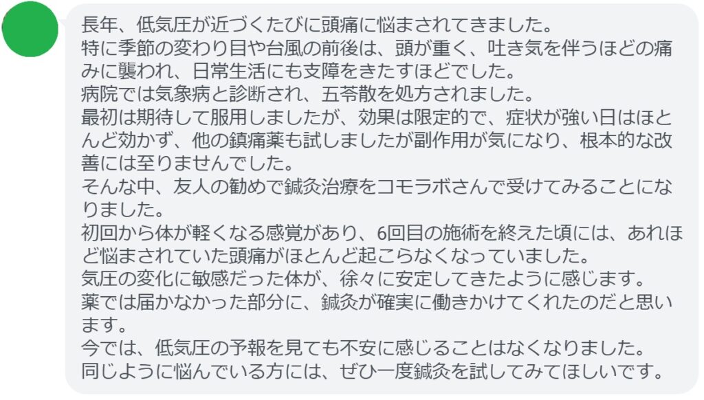 初回から体が軽くなる感覚があり、6回目の施術を終えた頃には、あれほど悩まされていた頭痛がほとんど起こらなくなっていました。