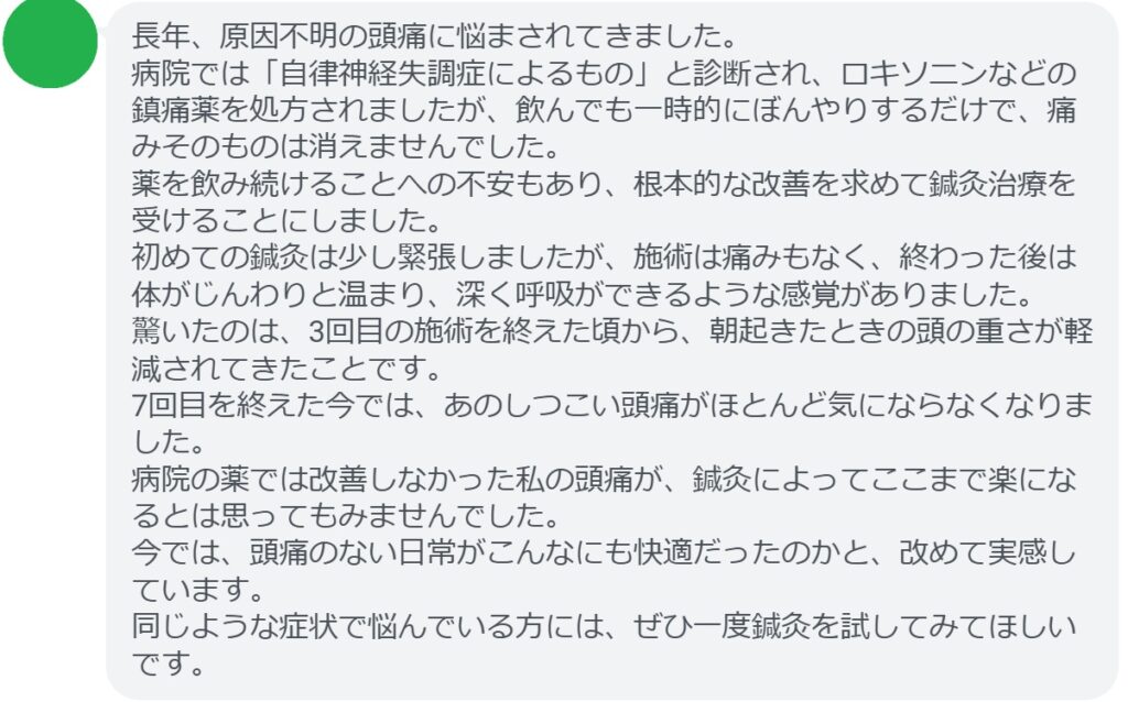 病院の薬では改善しなかった私の頭痛が、鍼灸によってここまで楽になるとは思ってもみませんでした。