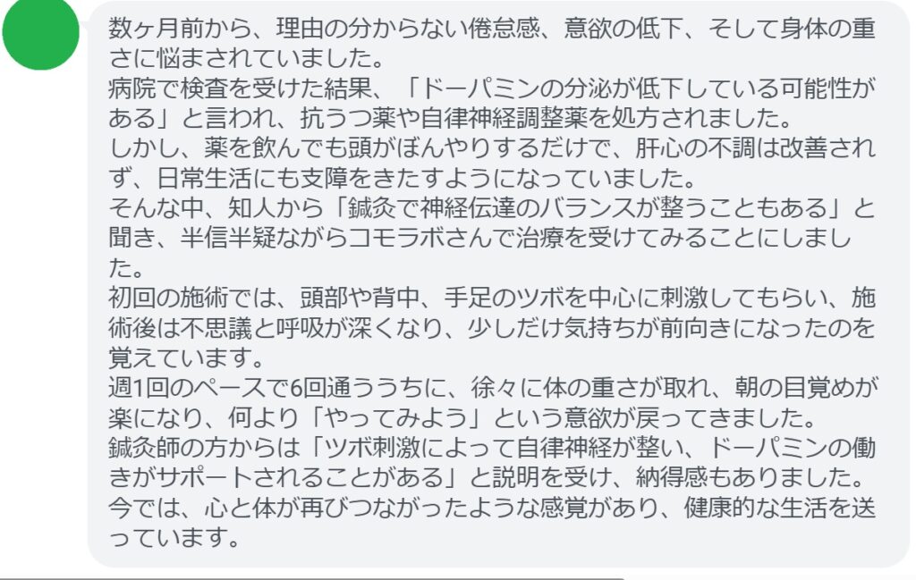 そんな中、知人から「鍼灸で神経伝達のバランスが整うこともある」と聞き、半信半疑ながらコモラボさんで治療を受けてみることにしました。
