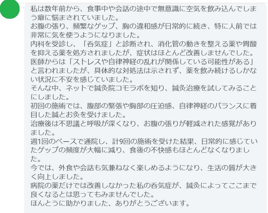 病院の薬だけでは改善しなかった私の呑気症が、鍼灸によってここまで良くなるとは思ってもみませんでした。