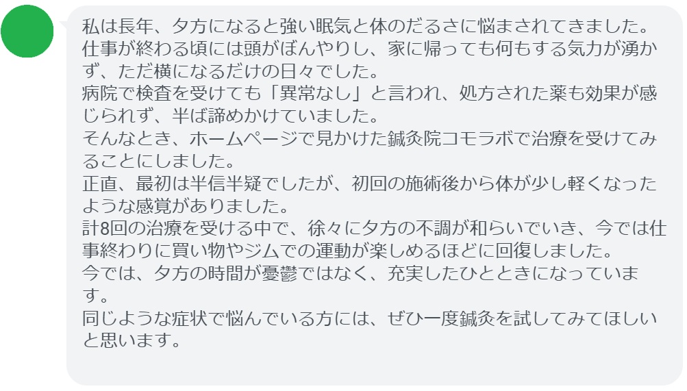 計8回の治療を受ける中で、徐々に夕方の不調が和らいでいき、今では仕事終わりに買い物やジムでの運動が楽しめるほどに回復しました。