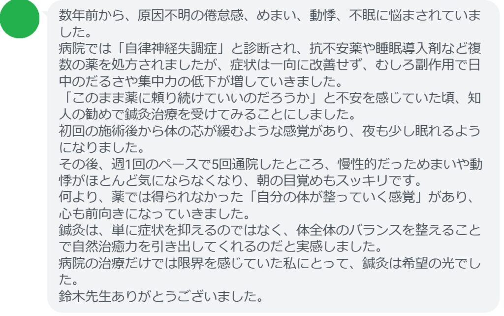 鍼灸は、単に症状を抑えるのではなく、体全体のバランスを整えることで自然治癒力を引き出してくれるのだと実感しました。