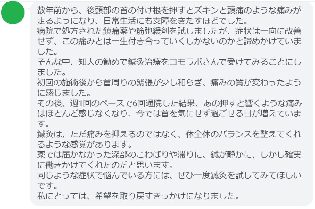 初回の施術後から首周りの緊張が少し和らぎ、痛みの質が変わったように感じました。