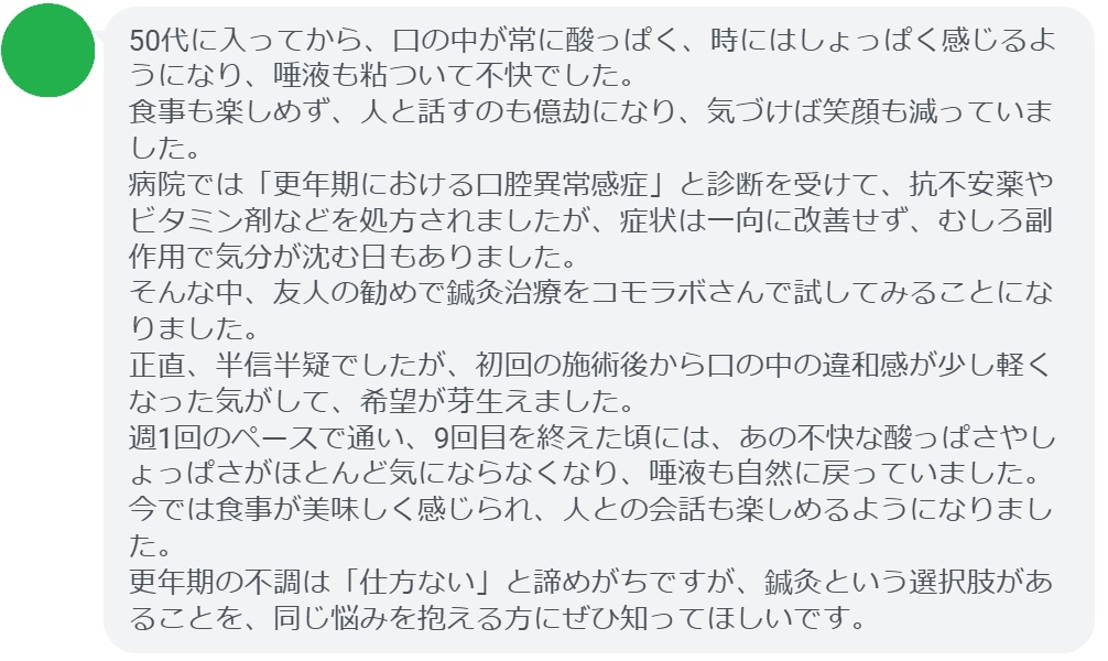 更年期の不調は「仕方ない」と諦めがちですが、鍼灸という選択肢があることを、同じ悩みを抱える方にぜひ知ってほしいです。