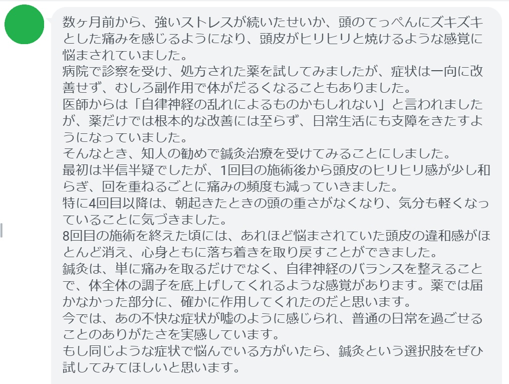 最初は半信半疑でしたが、1回目の施術後から頭皮のヒリヒリ感が少し和らぎ、回を重ねるごとに痛みの頻度も減っていきました。