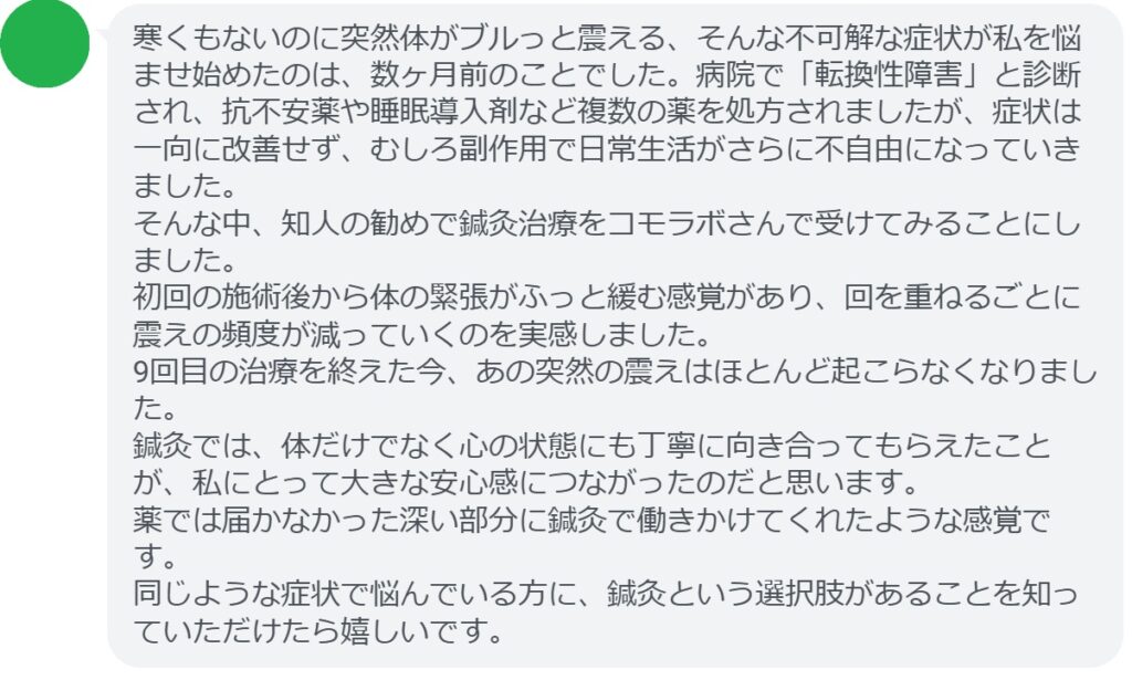 同じような症状で悩んでいる方に、鍼灸という選択肢があることを知っていただけたら嬉しいです。