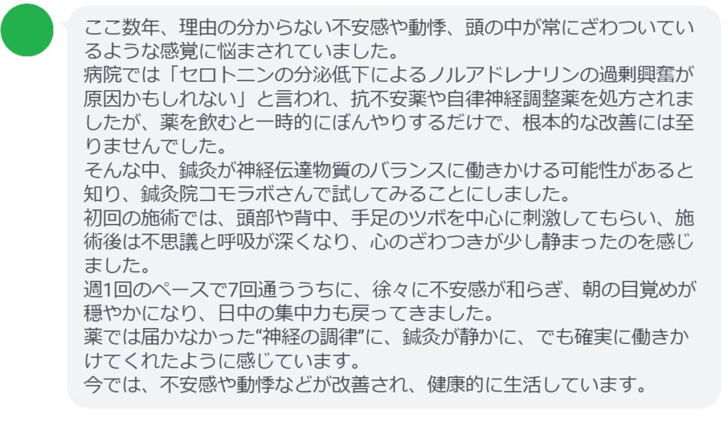 週1回のペースで7回通ううちに、徐々に不安感が和らぎ、朝の目覚めが穏やかになり、日中の集中力も戻ってきました。