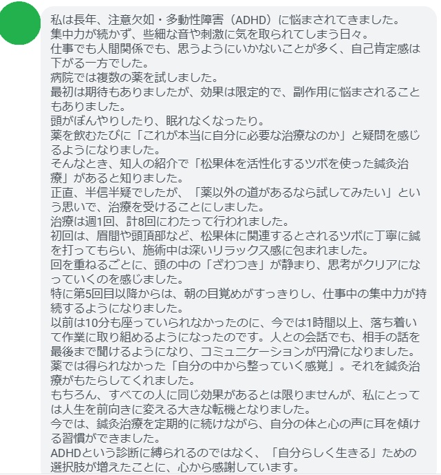 正直、半信半疑でしたが、「薬以外の道があるなら試してみたい」という思いで、治療を受けることにしました。