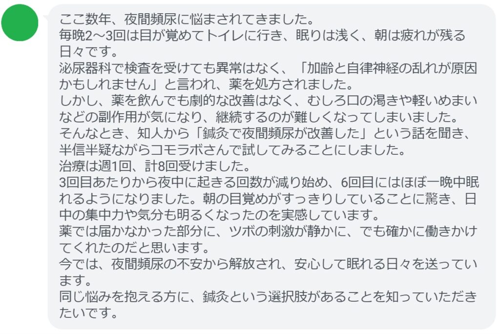 そんなとき、知人から「鍼灸で夜間頻尿が改善した」という話を聞き、半信半疑ながらコモラボさんで試してみることにしました。