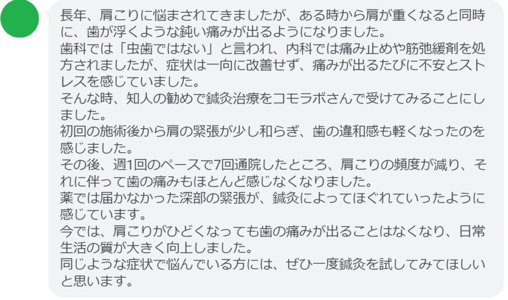 【肩こりで歯が浮く痛みが改善された方の感想(口コミレビュー)】