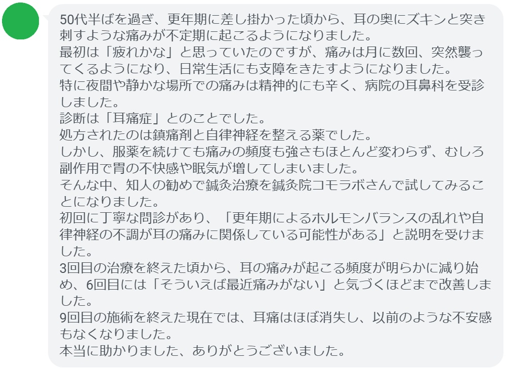 初回に丁寧な問診があり、「更年期によるホルモンバランスの乱れや自律神経の不調が耳の痛みに関係している可能性がある」と説明を受けました。3回目の治療を終えた頃から、耳の痛みが起こる頻度が明らかに減り始め、6回目には「そういえば最近痛みがない」と気づくほどまで改善しました。
