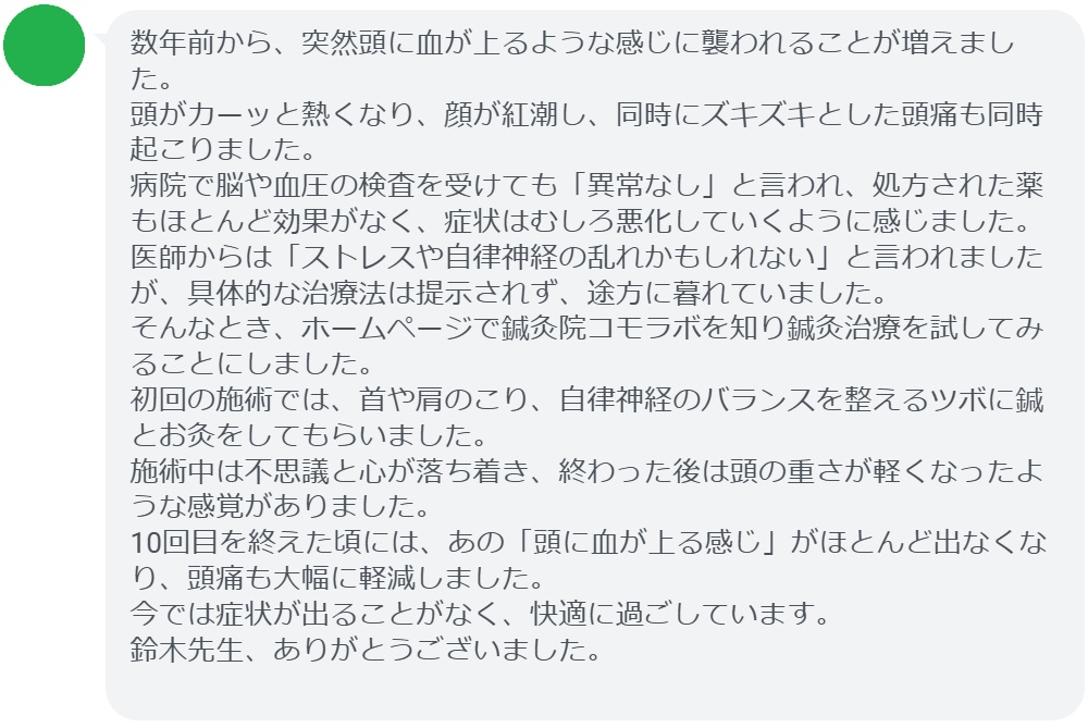 施術中は不思議と心が落ち着き、終わった後は頭の重さが軽くなったような感覚がありました。