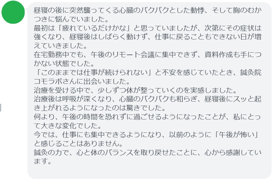 【昼寝後の動悸が改善された方の感想(口コミレビュー)】