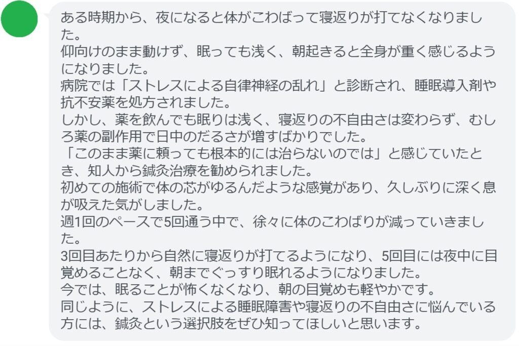 同じように、ストレスによる睡眠障害や寝返りの不自由さに悩んでいる方には、鍼灸という選択肢をぜひ知ってほしいと思います。