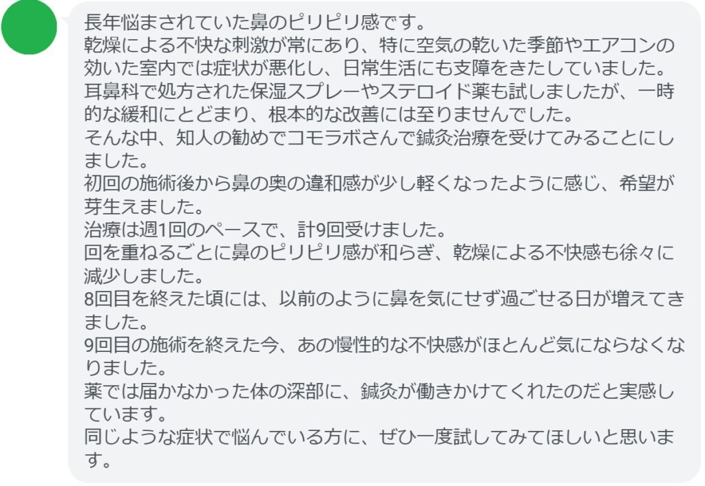 初回の施術後から鼻の奥の違和感が少し軽くなったように感じ、希望が芽生えました。