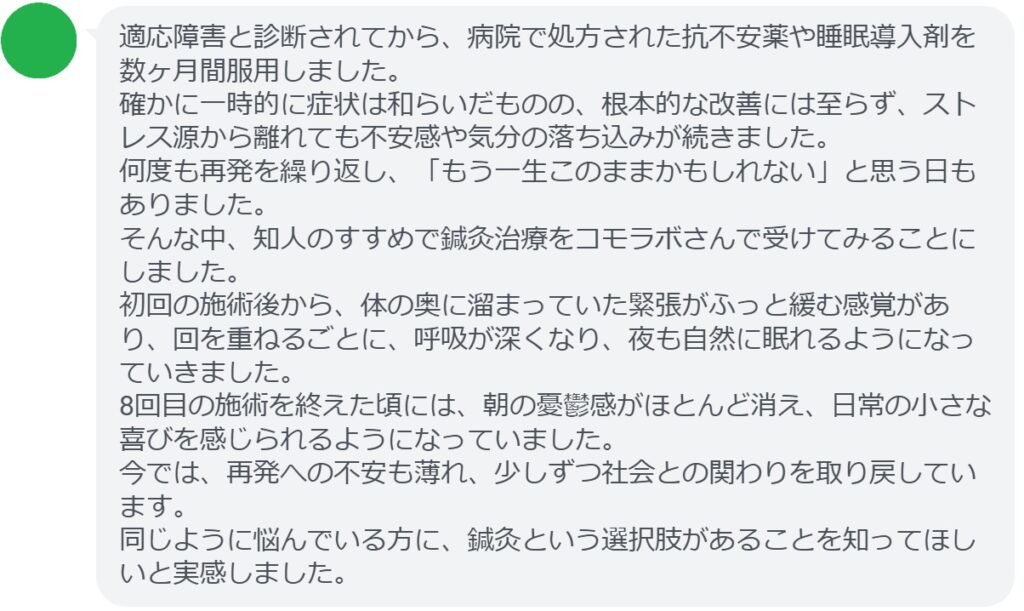 同じように悩んでいる方に、鍼灸という選択肢があることを知ってほしいと実感しました。