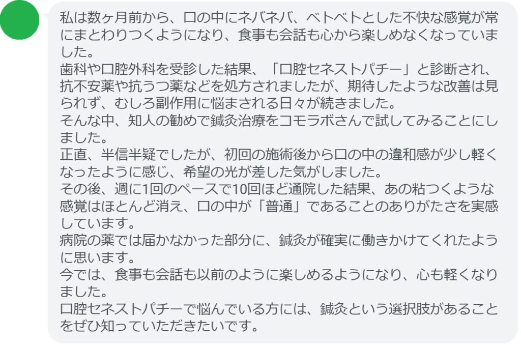 【口腔セネストパチーが改善された方の感想(口コミレビュー)】