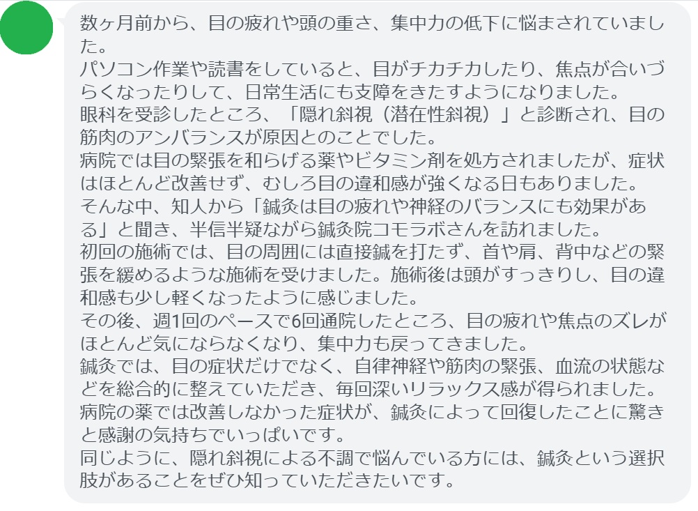【隠れ斜視(潜在性斜視)が改善された方の感想(口コミレビュー)】