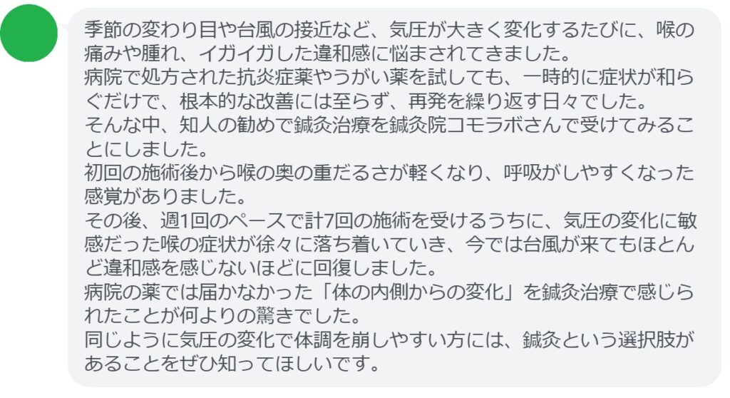 その後、週1回のペースで計7回の施術を受けるうちに、気圧の変化に敏感だった喉の症状が徐々に落ち着いていき、今では台風が来てもほとんど違和感を感じないほどに回復しました。