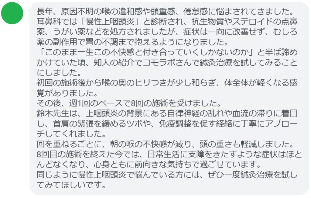 長年、原因不明の喉の違和感や頭重感、倦怠感に悩まされてきました。耳鼻科では「慢性上咽頭炎」と診断され、抗生物質やステロイドの点鼻薬、うがい薬などを処方されましたが、症状は一向に改善せず、むしろ薬の副作用で胃の不調まで抱えるようになりました。「このまま一生この不快感と付き合っていくしかないのか」と半ば諦めかけていた頃、知人の紹介でコモラボさんで鍼灸治療を試してみることにしました。初回の施術後から喉の奥のヒリつきが少し和らぎ、体全体が軽くなる感覚がありました。その後、週1回のペースで8回の施術を受けました。鈴木先生は、上咽頭炎の背景にある自律神経の乱れや血流の滞りに着目し、首肩の緊張を緩めるツボや、免疫調整を促す経絡に丁寧にアプローチしてくれました。回を重ねるごとに、朝の喉の不快感が減り、頭の重さも軽減しました。8回目の施術を終えた今では、日常生活に支障をきたすような症状はほとんどなくなり、心身ともに前向きな気持ちで過ごせています。同じように慢性上咽頭炎で悩んでいる方には、ぜひ一度鍼灸治療を試してみてほしいです。