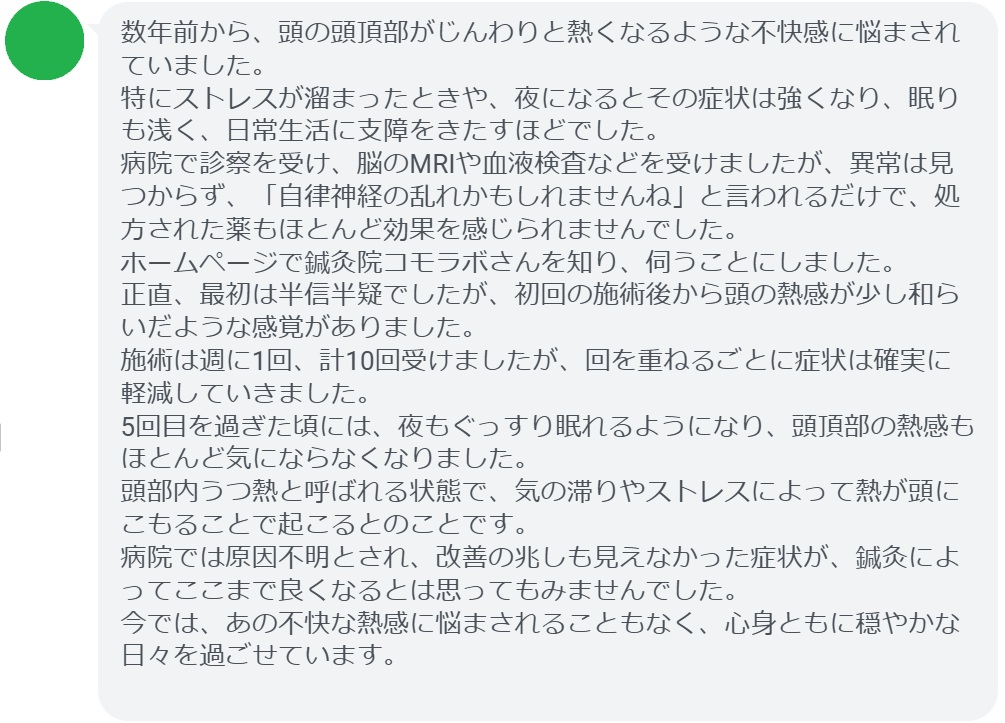 正直、最初は半信半疑でしたが、初回の施術後から頭の熱感が少し和らいだような感覚がありました。
