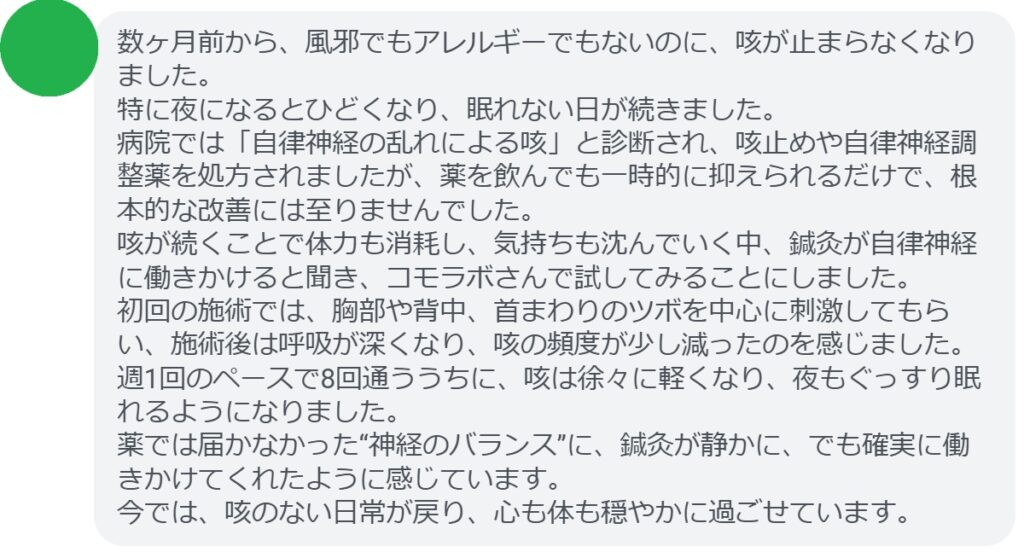 咳が続くことで体力も消耗し、気持ちも沈んでいく中、鍼灸が自律神経に働きかけると聞き、コモラボさんで試してみることにしました。