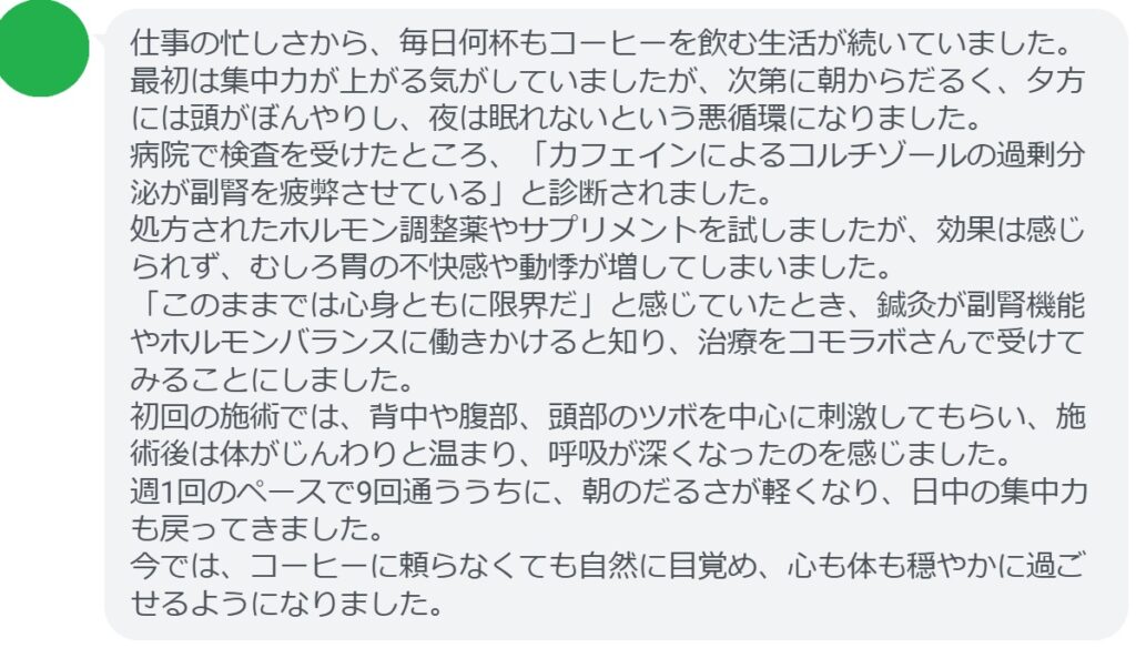 「このままでは心身ともに限界だ」と感じていたとき、鍼灸が副腎機能やホルモンバランスに働きかけると知り、治療をコモラボさんで受けてみることにしました。