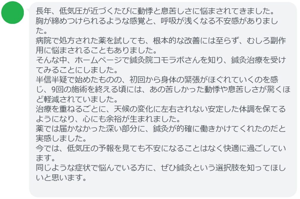 【低気圧による息苦しさと動悸が改善された方の感想(口コミレビュー)】
