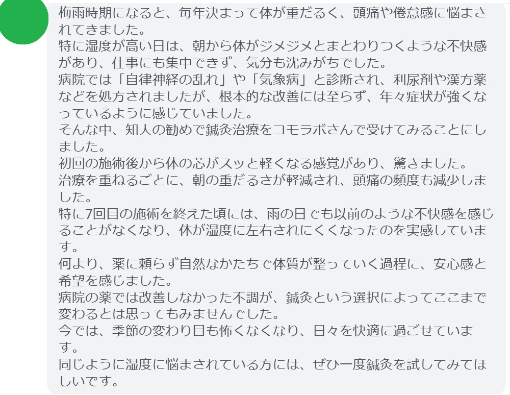 初回の施術後から体の芯がスッと軽くなる感覚があり、驚きました。治療を重ねるごとに、朝の重だるさが軽減され、頭痛の頻度も減少しました。特に7回目の施術を終えた頃には、雨の日でも以前のような不快感を感じることがなくなり、体が湿度に左右されにくくなったのを実感しています。何より、薬に頼らず自然なかたちで体質が整っていく過程に、安心感と希望を感じました。