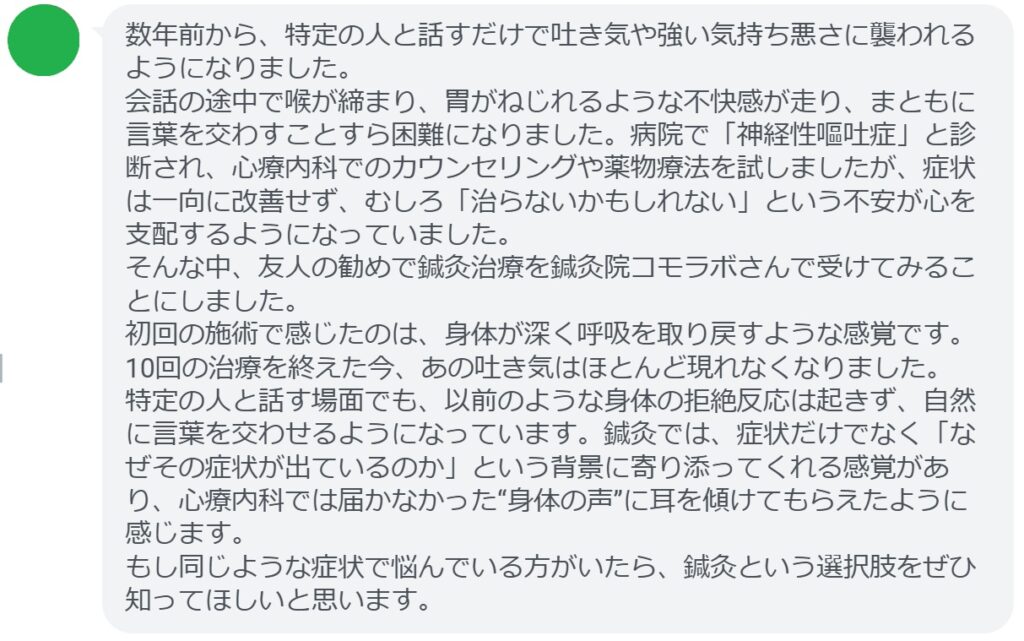 鍼灸では、症状だけでなく「なぜその症状が出ているのか」という背景に寄り添ってくれる感覚があり、心療内科では届かなかった“身体の声”に耳を傾けてもらえたように感じます。
