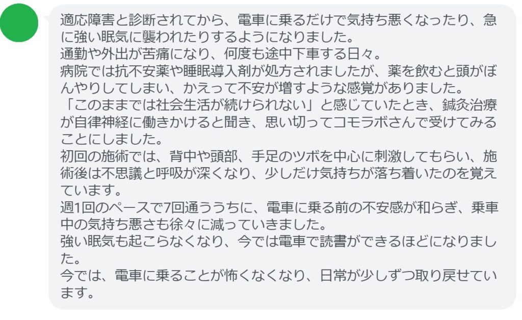 「このままでは社会生活が続けられない」と感じていたとき、鍼灸治療が自律神経に働きかけると聞き、思い切ってコモラボさんで受けてみることにしました。