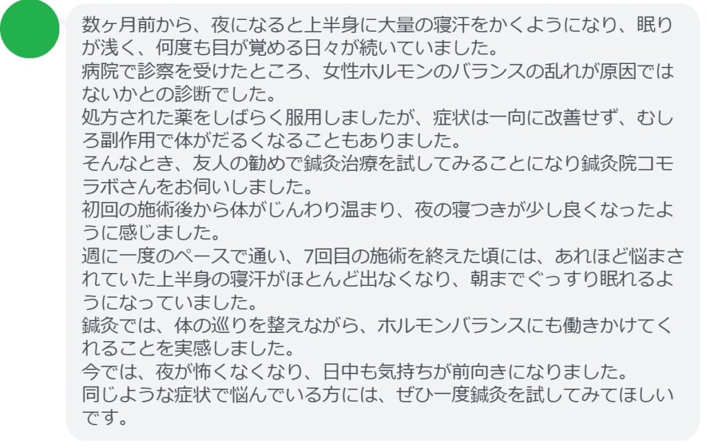 週に一度のペースで通い、7回目の施術を終えた頃には、あれほど悩まされていた上半身の寝汗がほとんど出なくなり、朝までぐっすり眠れるようになっていました。