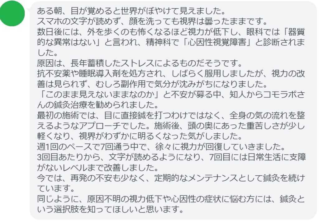 同じように、原因不明の視力低下や心因性の症状に悩む方には、鍼灸という選択肢を知ってほしいと思います。