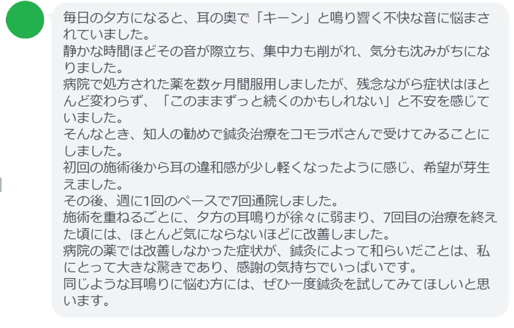 施術を重ねるごとに、夕方の耳鳴りが徐々に弱まり、7回目の治療を終えた頃には、ほとんど気にならないほどに改善しました。
