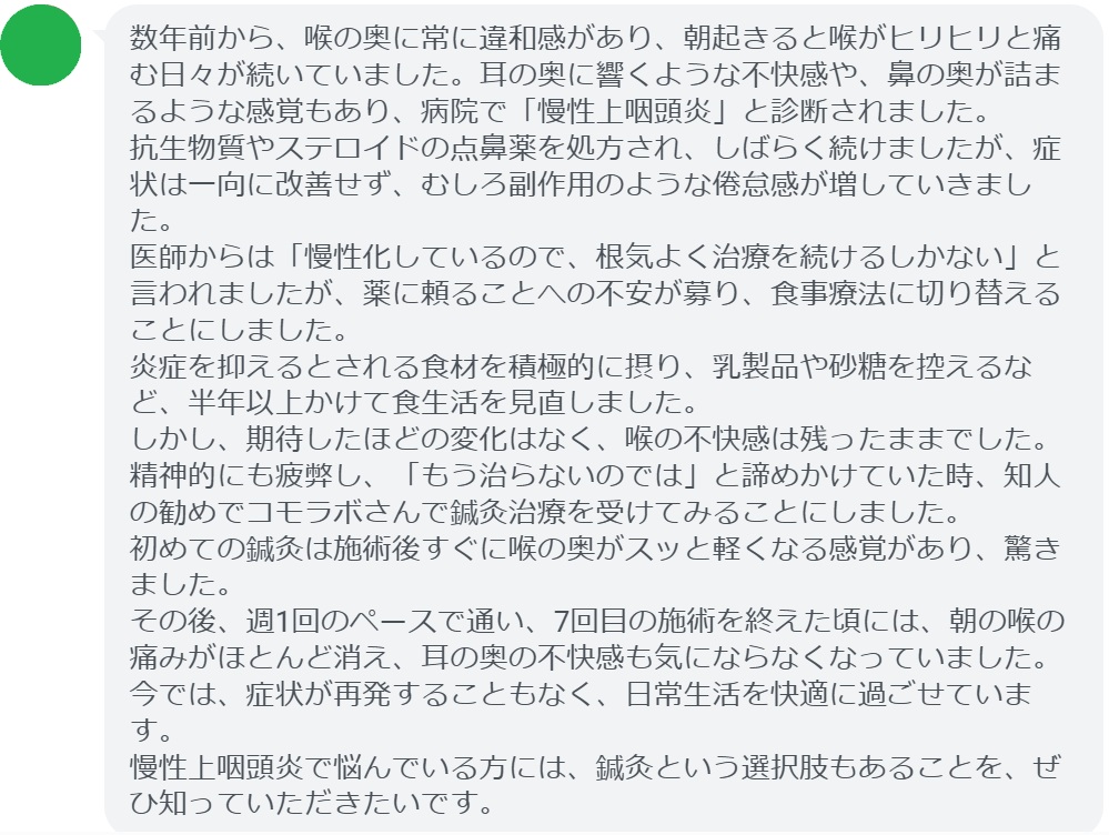 慢性上咽頭炎で悩んでいる方には、鍼灸という選択肢もあることを、ぜひ知っていただきたいです。