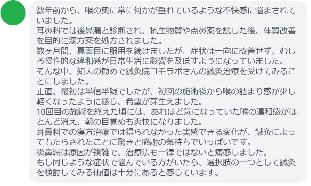 正直、最初は半信半疑でしたが、初回の施術後から喉の詰まり感が少し軽くなったように感じ、希望が芽生えました。