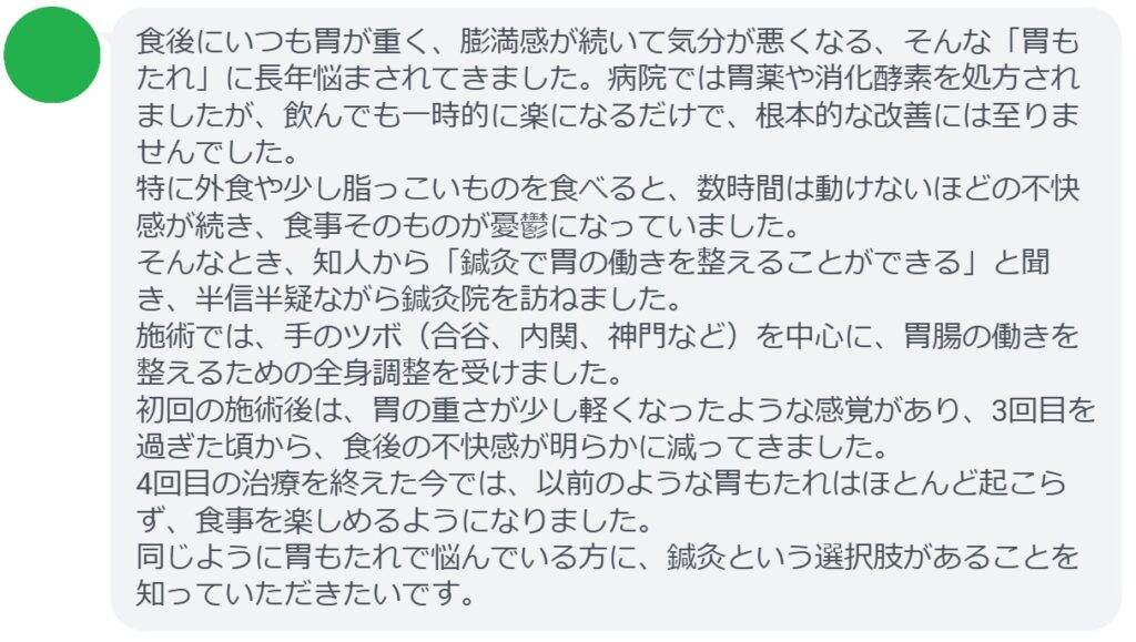 初回の施術後は、胃の重さが少し軽くなったような感覚があり、3回目を過ぎた頃から、食後の不快感が明らかに減ってきました。