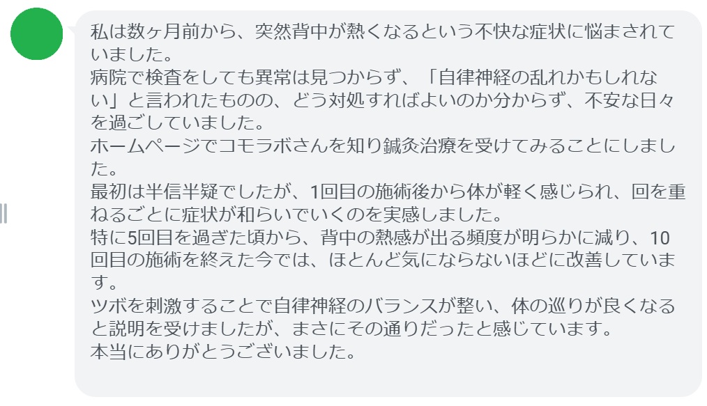 私自身、薬を飲んで治す方法があまり好きではないので、今後の健康管理する上でも、定期的に通院しようと思っています。親身に話を聞いてくださり、治療して頂き、本当にありがとうございました。