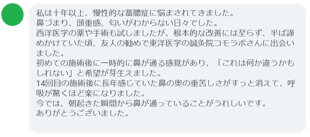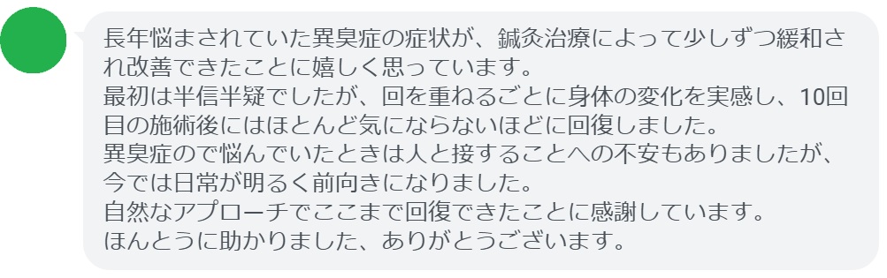 長年悩まされていた異臭症の症状が、鍼灸治療によって少しずつ緩和され改善できたことに嬉しく思っています。