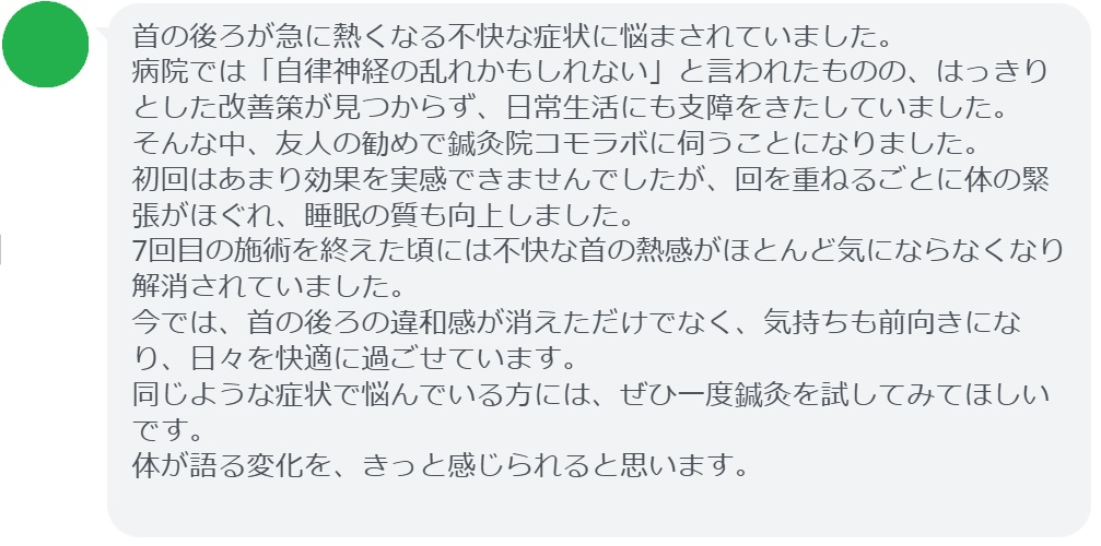 長い間、足に水が走るような冷たい感覚がありました。痛みではないけれど、常に違和感があり、歩くたびに気になっていました。病院では原因がはっきりせず、どうしていいか分からないまま過ごしていました。ホームページで鍼灸院コモラボを見つけて鍼灸治療を受けてみることにしました。最初の施術後から足の感覚が少し変わったように感じて驚きました。回を重ねるごとに、冷たさが和らぎ、足の奥にじんわりとした温もりが戻ってくるのを実感です。9回目の治療を終えた頃には、あの不快な感覚はほとんど消えていました。今では全く足が冷たくなる不快感が解消されています。改善していただきありがとうございます。