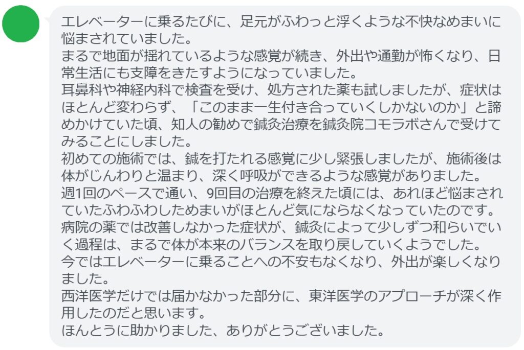耳鼻科や神経内科で検査を受け、処方された薬も試しましたが、症状はほとんど変わらず、「このまま一生付き合っていくしかないのか」と諦めかけていた頃、知人の勧めで鍼灸治療を鍼灸院コモラボさんで受けてみることにしました。