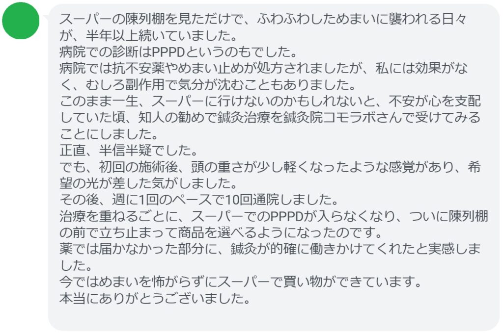 【陳列棚でめまい(PPPD)が改善された方の感想(口コミレビュー)】