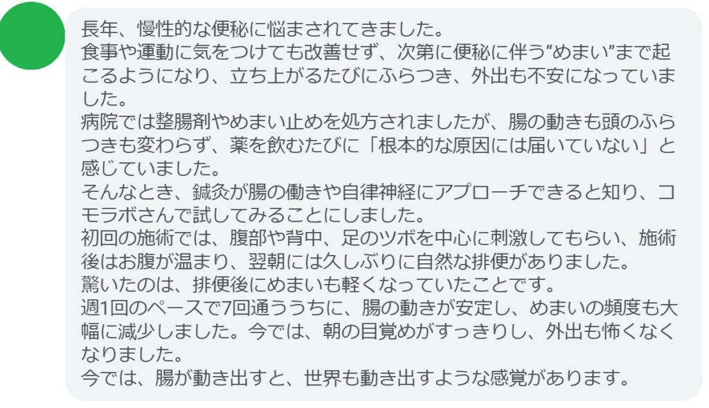 そんなとき、鍼灸が腸の働きや自律神経にアプローチできると知り、コモラボさんで試してみることにしました。