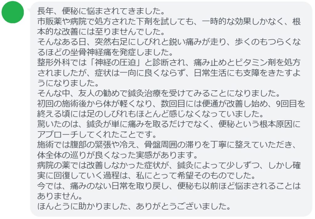 【便秘による坐骨神経痛が改善された方の感想(口コミレビュー)】