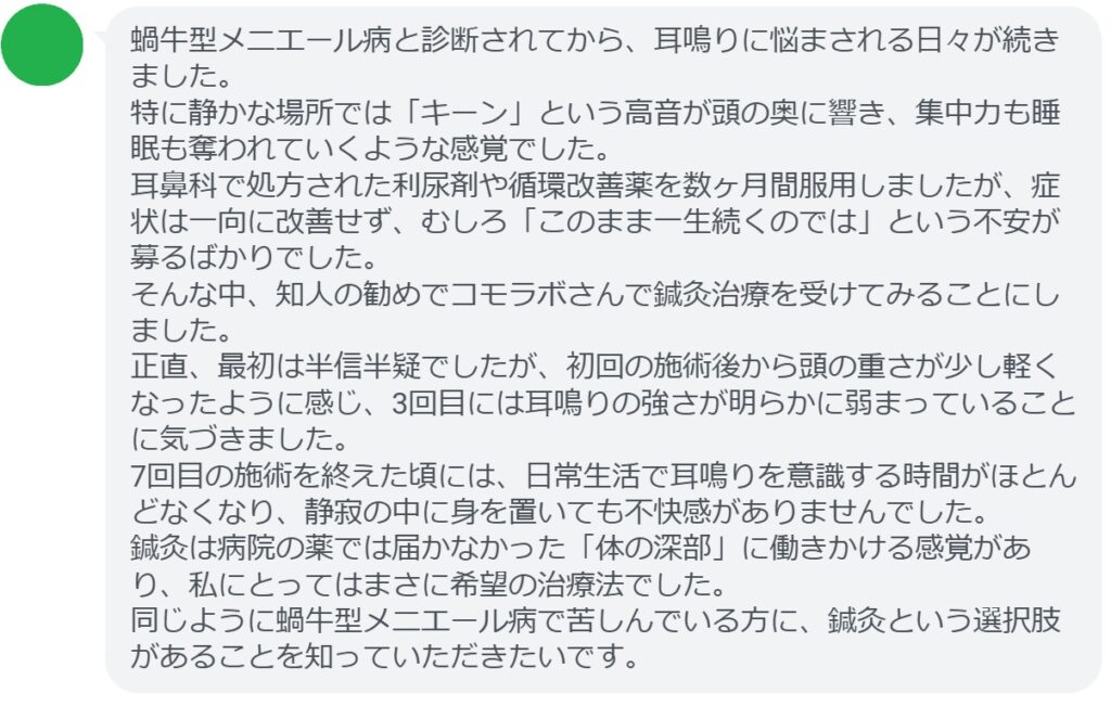 【蝸牛型メニエール病の耳鳴りが改善された方の感想(口コミレビュー)】