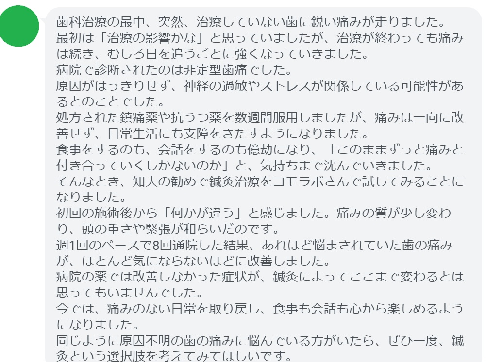 【歯科治療後の歯痛が改善された方の感想(口コミレビュー)】