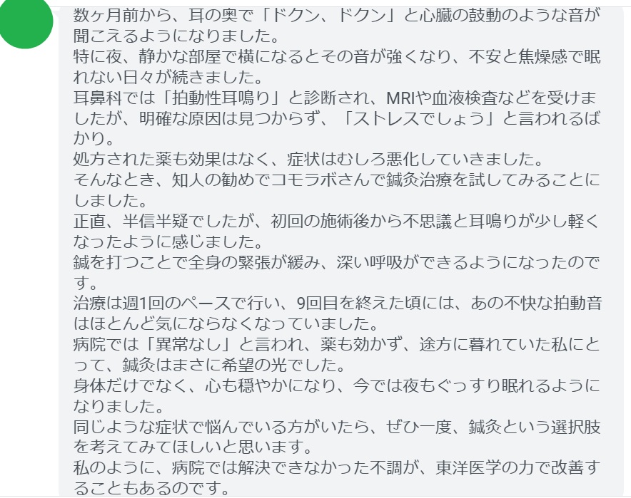 【拍動性耳鳴りが改善された方の感想(口コミレビュー)】
